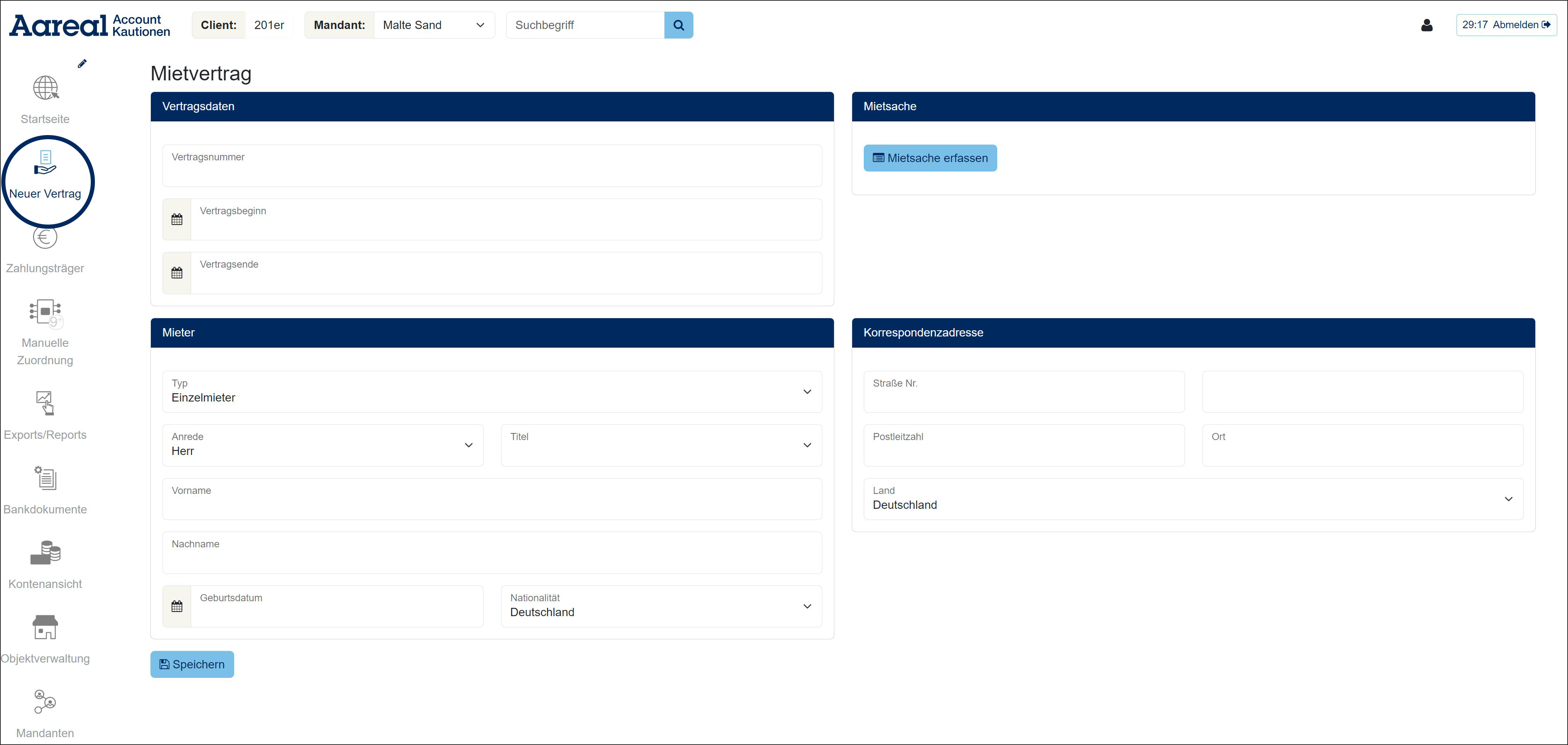 Zuerst sind die Stammdaten einzutragen, so wie sie im Mietvertrag zu finden sind. Das dauert in der Regel nur wenige Minuten. Mit diesen Angaben stellt Ihnen Aareal Account Kautionen sofort eine persönliche virtuelle IBAN zur Verfügung, die Sie Ihrem Mieter mitteilen. Diese kann er umgehend nutzen, um per Überweisung Einzahlungen zu tätigen, die zu 100 % sicher verwaltet und ihm zugeordnet werden.