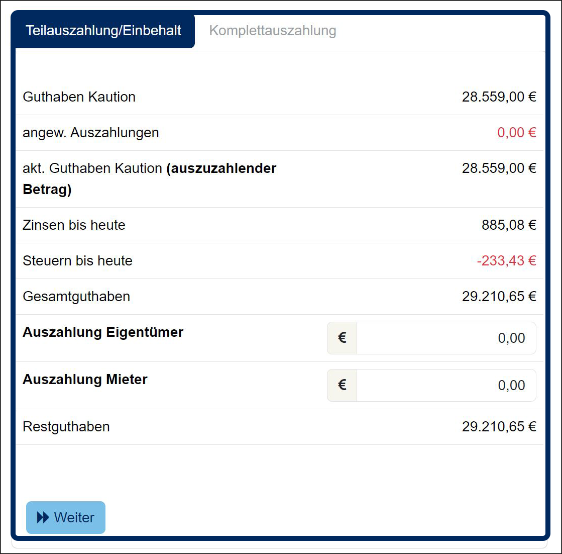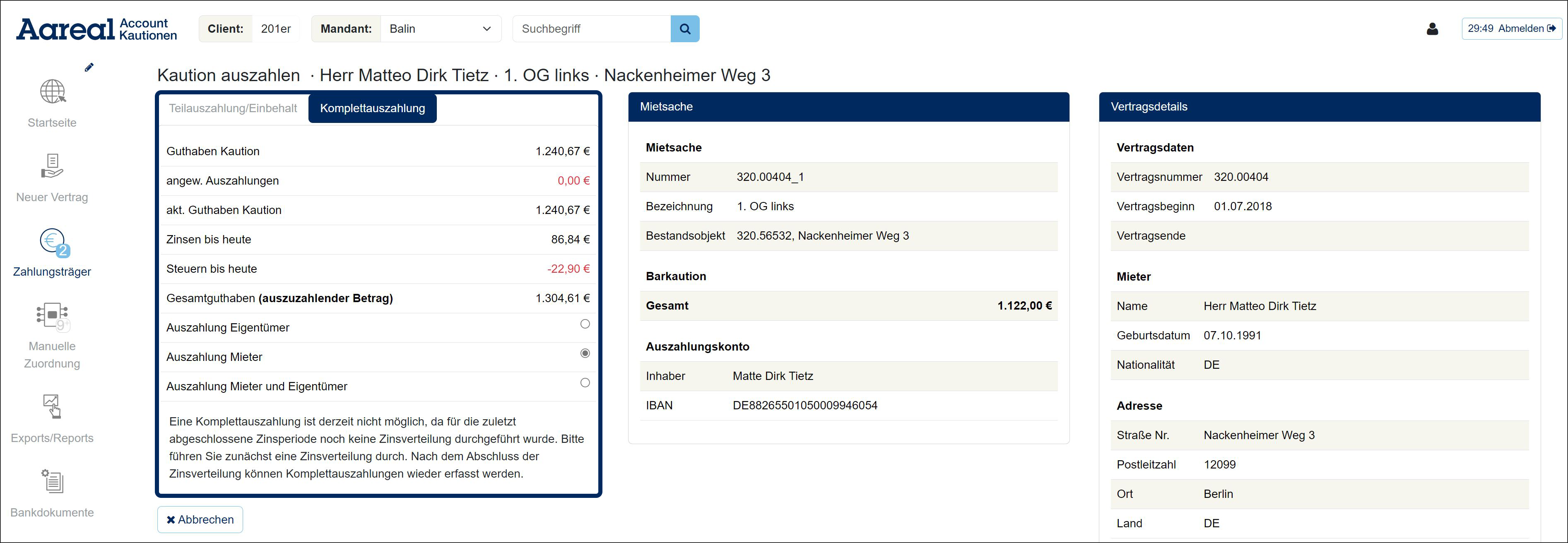 Ob Sie eine Komplettauszahlung oder nur eine Teilauszahlung der Kaution veranlassen möchten, Sie können in wenigen Schritten eine Auszahlung per Überweisung tätigen. Eine Auskunft über den verfügbaren Gesamtbetrag sowie eine Zinsabrechnung zum gewählten Stichtag erhalten Sie automatisch dazu. Auch Einbehalte können problemlos vorgenommen werden. In Aareal Account Kautionen finden Sie zudem eine Übersicht zu den bereits ausgezahlten, transferierten und gebuchten Auszahlungen.
