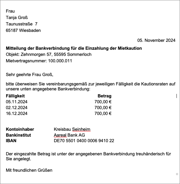 Zu jedem von Ihnen eingepflegten Mieter-Stammdatensatz stellen wir Ihnen eine persönliche virtuelle IBAN zur Verfügung. Diese reichen Sie an Ihren Mieter weiter. Unter Verwendung dieser Kennung kann er seine Kaution ganz oder in Teilen per Überweisung einzahlen. Sie wird automatisch dem entsprechenden Mieter-Konto in Aareal Account Kautionen zugewiesen.